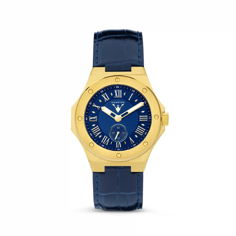 SAPPHIRE pairs a blue sunray dial with a gold-toned case. Featuring a leather strap from the Infinite Collection, 316L case, sapphire glass and 5 ATM resistance, this watch embodies timeless luxury